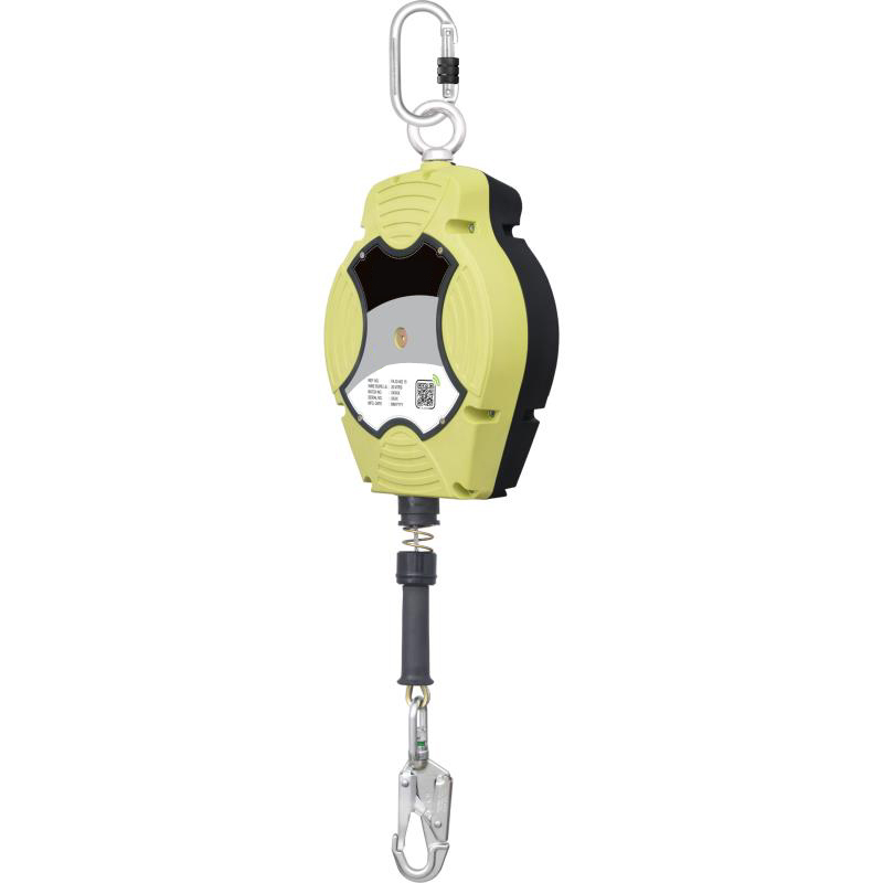 ANTICHUTE ATEX A RAPPEL AUTOMATIQUE DE CABLE, LONGUEUR 20 M, AVEC DISSIPATEUR D’ENERGIE INCORPORE ET TEMOIN DE CHUTE. Testé pour utilisateur pesant jusqu’à 140 KG. Câble acier galvanisé de 4,5 mm de diamètre. Ancrage émerillon. Equipé d’un mousqueton à vis et d’un mousqueton acier automatique double verrouillage doté d’un témoin de chute. Anse de portage. Brosse de balayage du câble. Fenêtre, facilement retirable pour avoir accès au mécanisme intérieur, pour vérification sans ouverture complète du boîtier. Carter polymère haute résistance. Poids : 7,43 kg. EN 360 + ATEX II2 G Exh IIC T6 Gb.