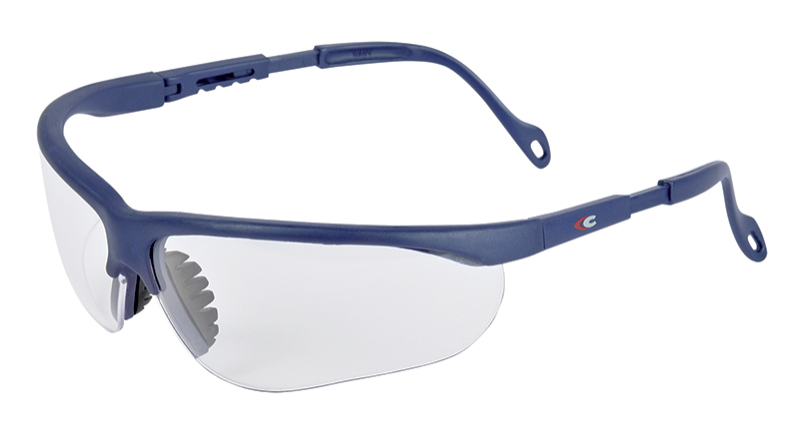 LUNETTES EFFILEES BRANCHES AJUSTABLES CONFORT. Monture et branches en nylon marine. Branches réglables en longueur. Oculaire avec protections latérales en polycarbonate incolore anti-buée (épaisseur 2,2 mm). CE EN166 et EN170 (2-1.2 1FTN).