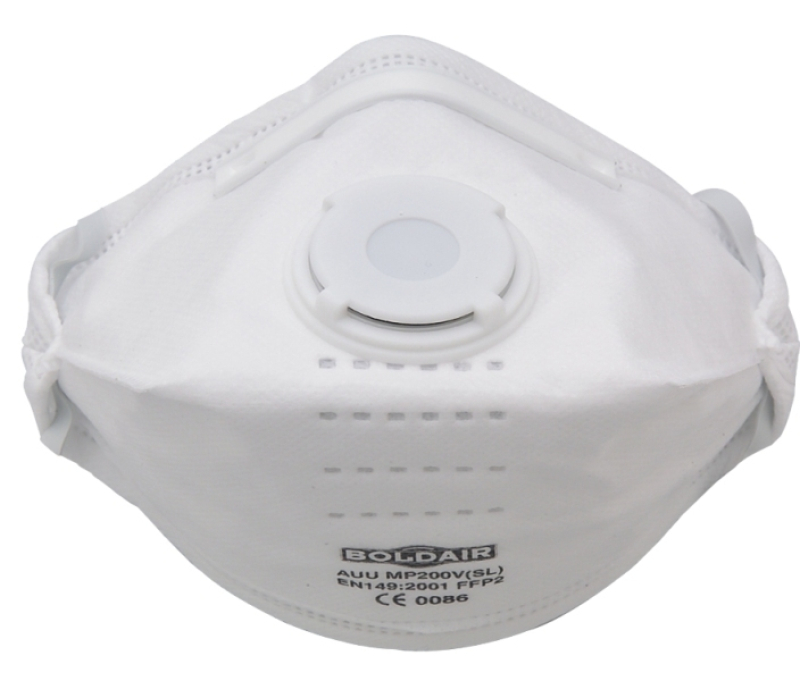 MASQUE PLIABLE FFP2VSL. Demi-masque filtrant contre les aérosols solides et liquides. Valve d’expiration. Média filtrant en polypropylène (MB) électrostatique. Couche extérieure, intérieure et de support en polypropylène (SMS). Serrage élastique. Pince-nez anatomique. Poids : 17 g. CE EN149 FFP2. Boîte distributrice de 20 pièces sous emballage individuel.