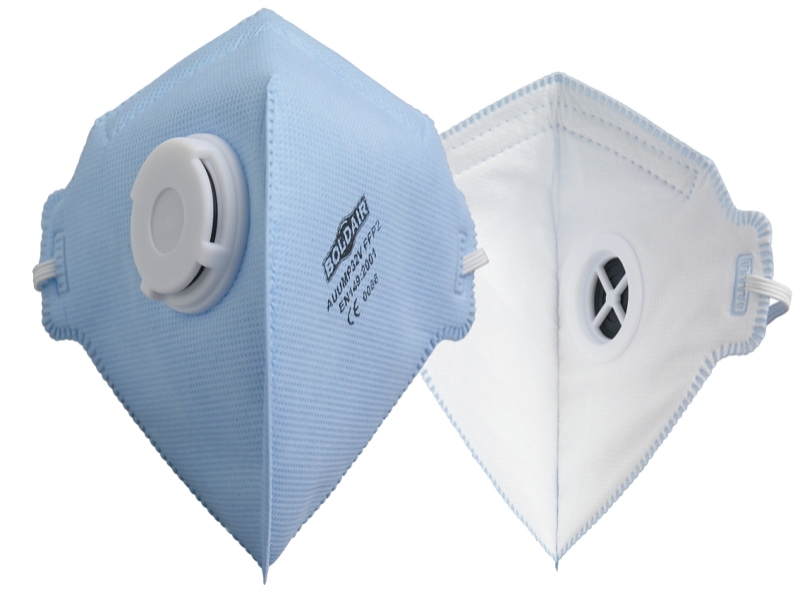 MASQUE PLIABLE VERTICALEMENT FFP2VSL. Demi-masque filtrant contre les aérosols solides et liquides. Valve d’expiration. Média filtrant en polypropylène (MB) électrostatique. Couche extérieure et intérieure (SMS). Serrage élastique sans latex ajustable. Pince-nez anatomique. Poids : 14 g. CE EN149 FFP2. Boîte distributrice de 20 pièces sous emballage individuel.