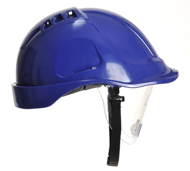 CASQUE INDUSTRIE ABS, VENTILE, AVEC LUNETTE DE PROTECTION INTEGREE (durée de vie maximum 7 ans). Casque avec coque ABS/Polycarbonate haute résistance. Visière réduite pour une bonne vision vers le haut. 4 orifices de ventilation permettant un flux d'air rafraîchissant autour de la tête. Coiffe intérieure avec harnais textile confort 6 points réglable par crémaillère de 56 à 63 cm (réglage de profondeur de casque possible également sur deux niveaux). Gouttière périphérique pour une bonne évacuation des eaux de pluie. Bandeau anti-sueur et jugulaire réglable inclus. Ecran lunette de protection rétractable en polycarbonate incolore avec traitement anti-rayures pour plus de durée, revêtement antibuée et pont de nez ergonomique pour plus de confort. Fentes latérales pour intégration d’un grand nombre d’accessoires (coquilles anti-bruit,…). Poids : 480 g. EN 397 (-30°C/+50°C, MM, LD) + EN 166 (1 FT).