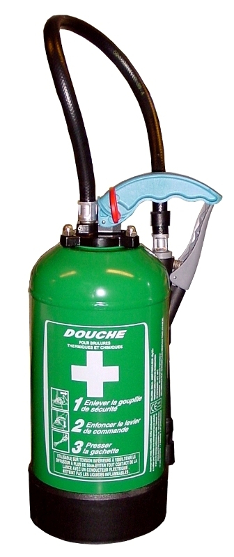 DOUCHE PORTATIVE AUTONOME. Fonctionne par simple pression sur la poignée grâce à une cartouche de gaz située à l’intérieur du réservoir (à changer après chaque utilisation). Capacité 6 litres. Livrée vide, à remplir d’eau minérale ou de sérum physiologique suivant les produits utilisés. Conforme norme CE et NF X08.003.