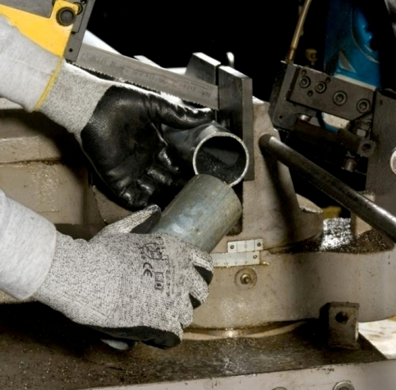 GANT ANTI-COUPURE NIVEAU 5, NITRILE GRIP-RESISTANT, CONTACTS GRAS. Gant HDPE/Nylon/Lycra tricoté une pièce, jauge 13, enduction grip nitrile noir sur la paume et les doigts. Poignet élastique. Taille 7 à 9. Activités : Manipulation d’objets tranchants et piquants - Manipulation fine en milieu humide (graisse, huile,…) - Recyclage des déchets - Fabrication de tôles - Industrie du verre - Atelier - Mécanique - Assemblage automobile - Mécanique de précision. Avantages : Gant ergonomique, d’une très bonne résistance mécanique. Adapté pour les contacts huileux répétés et prolongés.
