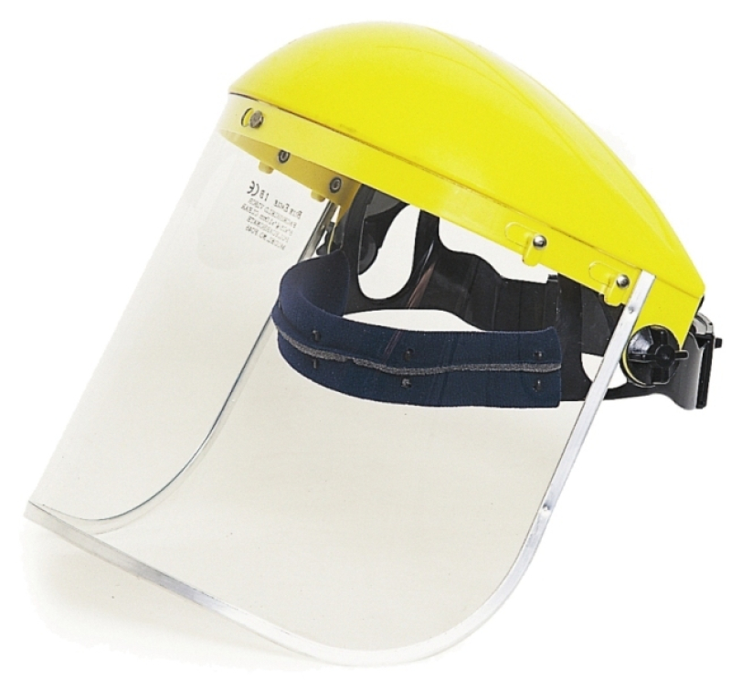 ECRAN DE PROTECTION FACIAL. Ecran constitué d'un serre-tête réglable, d'une calotte jaune et d'une visière transparente large relevable en polycarbonate avec bord renforcé 40 x 20 cm. Visière de rechange, référence ACC848. CE EN 166 (1B).