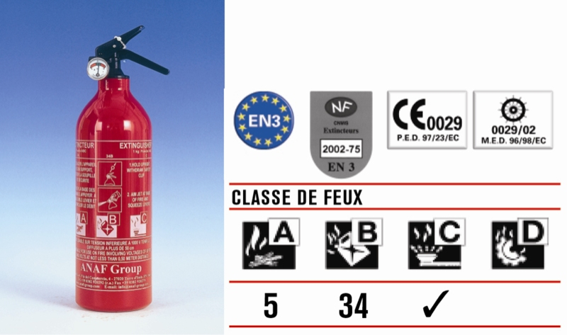 EXTINCTEUR VOITURE PRESSURISE A POUDRE « ABC » DE 1 KG AVEC MANOMETRE conçu spécialement pour l’automobile, la marine de plaisance et pour l’utilisation domestique. Température d’utilisation de –30°C à +60°C, par conséquent adéquat aussi dans les Pays à température très basse. Certifié selon la Directive Equipements Sous Pression PED 97/23/EC, Directive Européenne pour la Marine MED 96/98/EC et NF EN3. Capacité 1 kg. MANOMETRE: Manomètre de contrôle visuel de grande précision, permettant une vérification à tout moment de l’état de bon fonctionnement de l’extincteur. Extincteur fourni avec support de fixation pour véhicule.