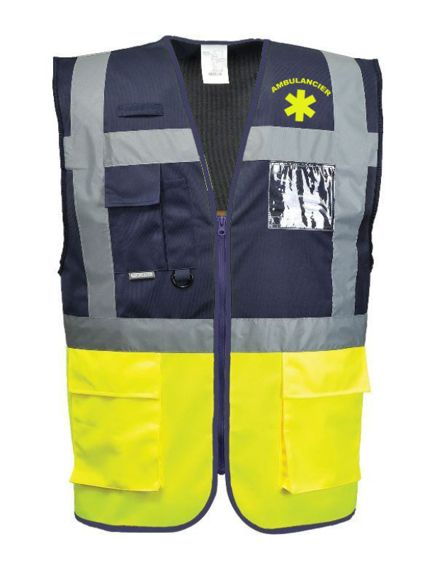 GILET UNISEXE HAUTE VISIBILITE BICOLORE MULTIPOCHES AMBULANCIER. 100% POLYESTER, 125 G/M². EN 13688, EN ISO 20471 CL1. TS A 3XL - JAUNE FLUO/MARINE ref.GILAC276JM
