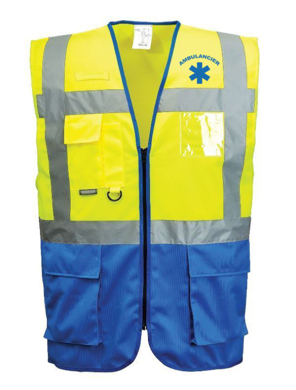 GILET UNISEXE HAUTE VISIBILITE BICOLORE MULTIPOCHES AMBULANCIER. 100% POLYESTER, 125 G/M². EN 13688, EN ISO 20471 CL1. TS A 3XL - JAUNE FLUO/BLEU ROYAL ref.GILAC476JBR