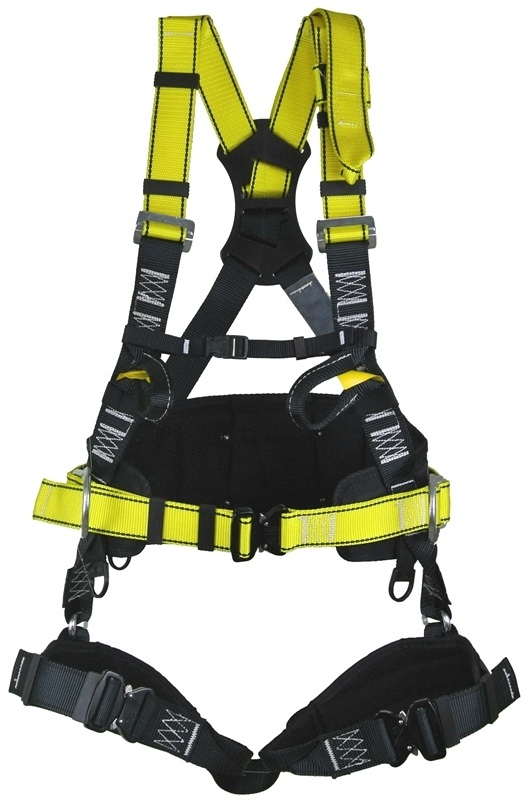 HARNAISPRO PYLONISTE GRANDE TAILLE. Harnais antichute et maintien au travail avec ceinture rotative (attaches sternale, dorsale et latérale). Réglage par boucles autobloquantes. Boucle automatique sur la ceinture de maintien et cuissardes. Attache sternale en anneaux de sangle cousus, attache dorsale en aluminium avec prolongateur. Cuissardes articulées et matelassées pour un confort maximum lors de déplacements et de suspension (diminue considérablement la compression arterielle au niveau des cuisses de l'utilisateur). Large ceinture de maintien rotative à 180°, réglable en mousse haute densité noire avec 2 anneaux de maintien au travail et anneaux porte-outils. Poids: 2180 g. EN 361 + EN 358. Correspondance de taille : tour de ceinture 110 à 135 cm / tour de cuisse 65 à 105 cm.