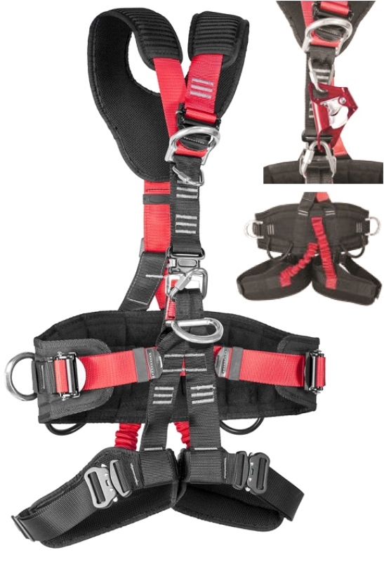 HARNAISPRO AXO. Harnais antichute Extrême Confort, ascension et maintien au travail (attaches sternale, ventrale, dorsale et latérale). Pont ventral équipé de 2 maillons delta pour la mise en place et l’utilisation d’un bloqueur ventral. Attaches sternale, ventrale, dorsale et latérales en Dé aluminium. Harnais à enfilage simple et rapide équipé d’un dosseret PAD post-formé en mousse 3D FLEX (légèreté, confort, flexibilité et aération associés) et d’une bouclerie automatique de fermeture du V double sécurité. Large ceinture de maintien, mousse 3D HD ergonomique. Larges cuissardes molletonnées pour un confort maximum lors des déplacements et situations en suspension. Boucles de réglage du V et de la ceinture de maintien Safety-Fast sûr, rapide et fluide. Ponts arrière de cuissardes extensible garantissant le maximum de confort lors de progressions. Boucles de fermeture de cuissardes automatiques avec témoin de fermeture intégré. Anses porte-outils renforcées équipant la ceinture de maintien. Etiquette normative protégée sous une pochette en tissu renforcé avec rabat auto-agrippant. Pour utilisateur pesant jusqu’à 140 kg. Poids (« plume ») : 1780 g. EN 361 + EN 358 + EN 813. Correspondance de taille : tour de taille 80 à 120 cm / tour de cuisse 50 à 85 cm / tour de torse 90 à 140 cm / stature 170 à 200 cm.