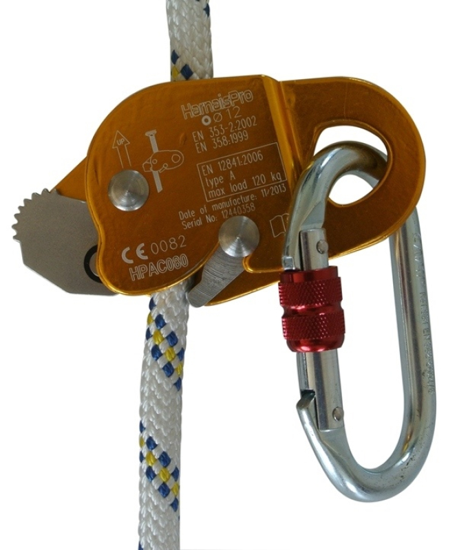 HARNAISPRO STOP ALU ANTICHUTE MOBILE ET BLOQUEUR. Coulisseau antichute STOP en alliage d’aluminium et acier inox, pour corde semi-statique de 12 mm de diamètre. Polyvalent, il peut être utilisé suivant trois modes de fonctionnement; soit comme dispositif d’arrêt des chutes, soit comme système de maintien et de retenue au travail, soit comme dispositif d’accès sur corde (fourni avec un mousqeton OK KARAM). Poids 192 gr. EN 353-2 + EN 358 + EN 12841 - A 120 kg.