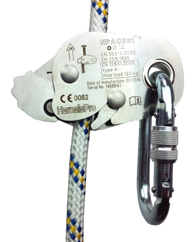 HARNAISPRO STOP INOX ANTICHUTE MOBILE ET BLOQUEUR. Coulisseau antichute STOP en acier inoxydable, pour corde semi-statique de 12 mm de diamètre. Polyvalent, il peut être utilisé suivant trois modes de fonctionnement; soit comme dispositif d’arrêt des chutes, soit comme système de maintien et de retenue au travail, soit comme dispositif d’accès sur corde (fourni avec un mousqeton OK KARAM). Poids 350 gr. EN 353-2 + EN 358 + EN 12841 - A 120 kg.