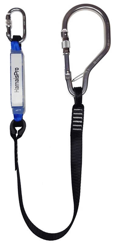HARNAISPRO ABSORBER LIMITED-SI 100 AZ122. Longe antichute sangle avec absorbeur d’énergie intégré. Longueur de sangle (largeur 30 mm) avec l’absorbeur à extension limitée + connecteurs (OK KARAM + HPAZ122): 1,30 m. Extrémité en boucle cousue et cossée. Poids : 780 g. EN 355.