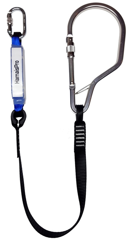 HARNAISPRO ABSORBER LIMITED-SI 100 AZ125. Longe antichute sangle avec absorbeur d’énergie intégré. Longueur de sangle (largeur 30 mm) avec l’absorbeur à extension limitée + connecteurs (OK KARAM + HPAZ125): 1,38 m. Extrémité en boucle cousue et cossée. Poids : 850 g. EN 355.