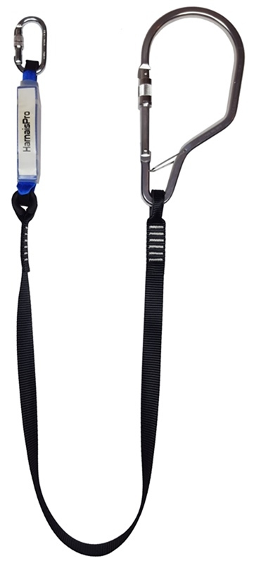 HARNAISPRO ABSORBER LIMITED-SI 150 AZ125. Longe antichute sangle avec absorbeur d’énergie intégré. Longueur de sangle (largeur 30 mm) avec l’absorbeur à extension limitée + connecteurs (OK KARAM + HPAZ125): 1,88 m. Extrémités en boucles cousues et cossées. Poids : 950 g. EN 355.