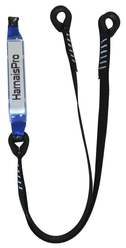 HARNAISPRO ABSORBER LIMITED-SY 100. Longe antichute sangle Y avec absorbeur d’énergie intégré. Longueur de sangle (largeur 30 mm) avec l’absorbeur à extension limitée: 1,00 m. Extrémités en boucles cousues et cossées. Poids : 320 g. EN 355. A compléter par des connecteurs suivant configuration souhaitée.