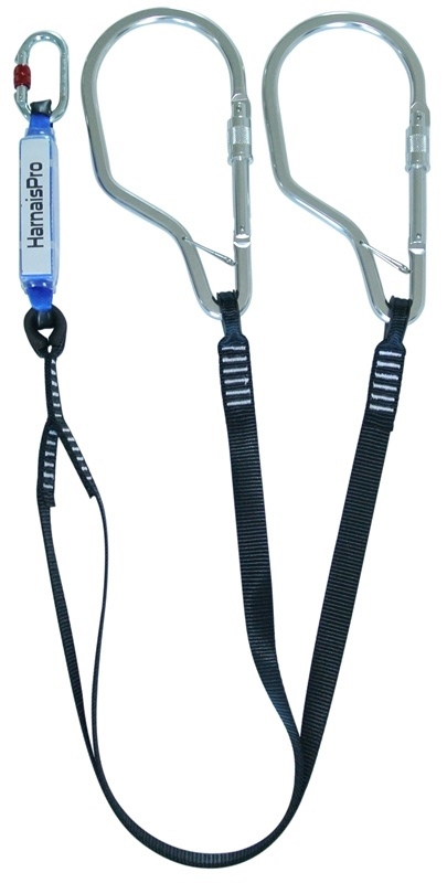 HARNAISPRO ABSORBER LIMITED-SY 150 AZ125. Longe antichute sangle Y avec absorbeur d’énergie intégré pour évolution en unité de stockage. Longueur de sangle (largeur 30 mm) avec l’absorbeur à extension limitée + connecteurs (OK KARAM + HPAZ125): 1,88 m. Extrémités en boucles cousues et cossées. Poids : 1580 g. EN 355.
