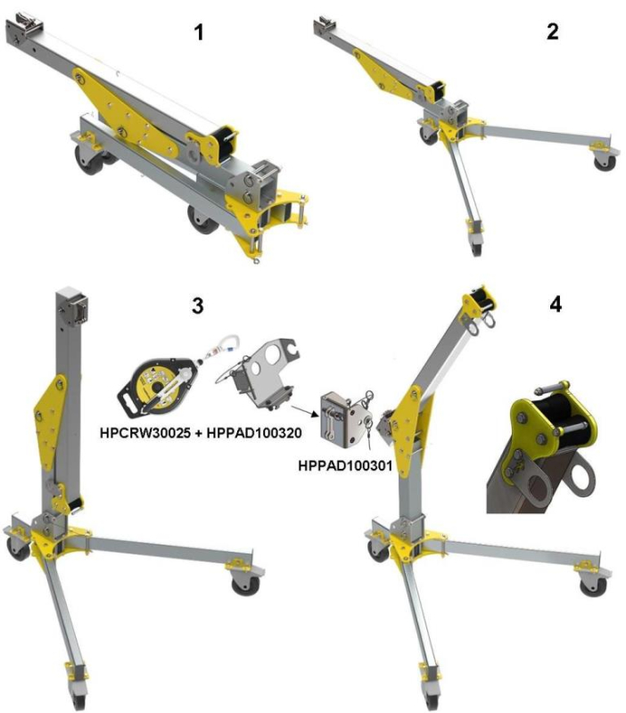 HARNAISPRO POTENCE MOBILE DE SECURITE, CAPACITE 500 KG. La potence en aluminium HPLAD001 est un point d'ancrage selon la norme EN 795B. Elle est destinée à protéger une personne à la fois. Elle est fabriquée en aluminium renforcé, anodisé et d’éléments en acier inoxydable avec peinture époxy. La potence HPLAD001 peut être équipé d’un support universel HPPAD100301 (option) pour adapter la platine fixation HPPAD100320 (option) prévu pour l’utilisation de l’antichute à rappel automatique et de sauvetage à câble de 25m HPCRW30025 (option). La potence est compacte, rapide et facile de mise en œuvre grâce aux broches de fixations imperdables. Elle est équipée de 3 roues pivotantes de 160 mm de diamètre avec frein intégré. Son déplacement est aisée et les freins assurent une parfaite sécurité. La tête du bras de potence est équipée d’une poulie à rouleaux avec dispositif de passage de câble sécurisé, sans utilisation d’outillage et de 2 points d’ancrage intégrés. Poids : 36 kg. Dispositif idéal pour travaux sur regards, STEP, réseaux d’assainissement,… Adapté aux exigences CATEC.