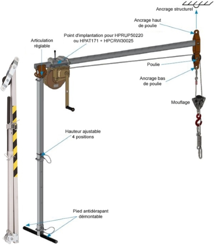 HARNAISPRO POTENCE SUSPENDUE ALUMINIUM DE SECURITE ET DE LEVAGE, CAPACITE 500 KG. Potence suspendue pour la sécurisation du personnel travaillant en espaces confinés et/ou pour le levage de charge. La potence suspendue se fixe au moyen d’un mousqueton à un point d’ancrage approprié. Le dispositif est équipé d’une jambe réglable (4 positions, de 1,29 m à 1,74 m) en alliage d'aluminium avec un pied antidérapant en caoutchouc. Bras en alliage d’aluminium équipé en extrémité d’une poulie avec flasques en acier galvanisé et réa en polymère composite. Articulation bras / poulie réglable en 5 positions, permettant d’orienter et d’ajuster rapidement la potence à la hauteur souhaitée. Dimensions de transport : 190 x 22 x 14 cm. Hauteur de travail : 71 à 271 cm. Poids : 8 kg. EN795/A, TS16415/A. Capacité de levage de 140 kg (200 kg avec utilisation de la poulie HPPL101) avec le treuil de sécurité Réf HPRUP50220 équipé d’un câble de 20m. Utilisable avec l’enrouleur antichute à câble de 25 m et de sauvetage Réf HPCRW30025 avec son support HPAT171. Adapté aux exigences CATEC.