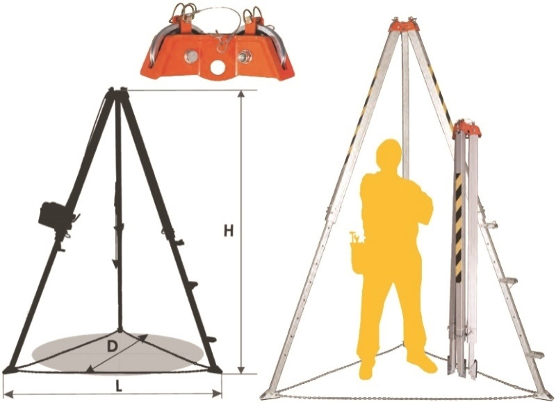HARNAISPRO TREPIED ALUMINIUM DE SECURITE ET DE LEVAGE XXXL, 1,79 M REPLIE, 2,89 M DEPLOYE, CAPACITE 500 KG. Trépied pour la sécurisation du personnel travaillant en espaces confinés et/ou pour le levage de charge. Pieds équipés de patin antidérapant. Chaîne de sécurité reliant les 3 pieds. Tête de trépied équipée de 2 poulies avec guide et de 3 points d’ancrage. Utilisable en zones EX. Dimensions de transport : 190 x 30 x 30 cm. Hauteur de travail : 179 à 289 cm. Diamètre du trou maximum : 173 à 271 cm. Distance entre les jambes : 147 à 232 cm. Poids : 37 kg. EN795B, TS16415B. Utilisable par 2 personnes en même temps. Capacité de levage de 140 kg avec le treuil de sécurité Réf HPRUP502A25 équipé d’un câble de 25m. Utilisable avec l’enrouleur antichute à câble de 25 m et de sauvetage Réf HPCRW30025 avec son support HPAT172. Adapté aux exigences CATEC. Capacité de levage de 500 kg avec le treuil de levage Réf HPRUP502AT25 équipé d’un câble de 25m.