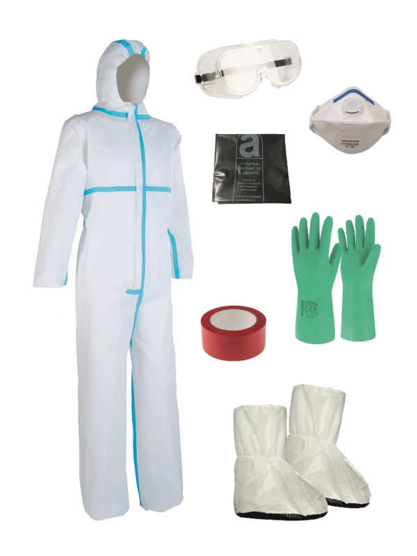 KIT DE PROTECTION AMIANTE PRET A L'EMPLOI comprenant : 1 lunette masque en PVC, amagnétique, occulaire en polycarbonate incolore, EN 166 (BT, 4, 9, classe optique 1) + 1 demi-masque respiratoire FFP3, pli horizontal, avec valve d’expiration et pince-nez EN 149 : 2001 + A1 : 2009 + 1 paire de gants nitrile non supporté T10, flocage coton (Longueur: 330 mm. Epaisseur: 0,38 mm), EN 420 : 2003 + A1: 2009 / EN 388 (3, 1, 0, 1, X) / EN ISO 374-1 (AJKLMNO) / EN ISO 374-4 / EN ISO 374-5 + 1 combinaison de protection TXL, non-tissé SMS 55 g/m², coutures étanchées, EN ISO 13688 / EN ISO 13982-1 (Type 5) / EN 13034 (Type 6) / EN 1073-2 (Classe 1) + 1 paire de surbottes polypropylène, serrage élastique, semelle anti-dérapante en PVC + 1 rouleau ruban adhésif 5 x 330 cm + 1 sac à déchets avec marquage amiante 90 x 110 cm.