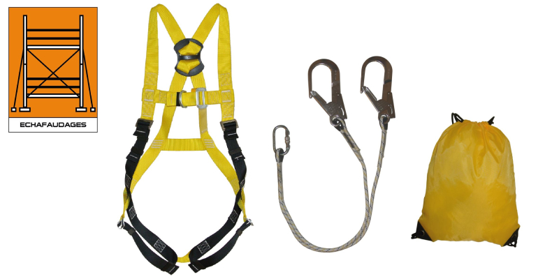 HARNAISPRO KIT ANTICHUTE RETENUE ECHAFAUDAGE 1, PRET A L'EMPLOI - Comprenant : 1 harnais complet HP11 M-XL + 1 longe Y de retenue en drisse longueur 1 m, HPLB102E + 1 sac baluchon HPAX09. Kit prêt à l’emploi pour le montage d’échafaudage à très faible hauteur, limitant au maximum le tirant d’air. La longe de retenue doit toujours être connectée le plus haut possible par rapport à l’utilisateur. Activité : retenue sur échafaudage.