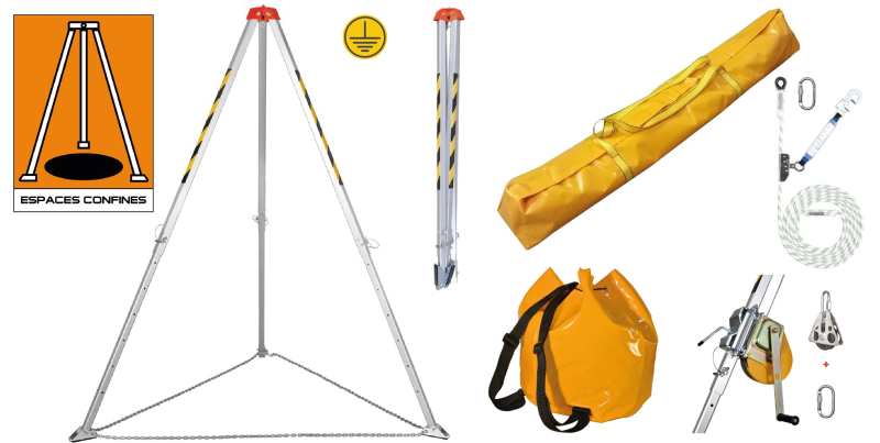 HARNAISPRO KIT TREPIED ESPACE CONFINE 1A - Comprenant : 1 trépied de sécurité compact HPTM9 + 1 sac de transport pour trépied, HPAX016 + 1 coulisseau antichute mobile imperdable avec support d’assurage en drisse 20 m HPAC06020 + 1 mousqueton acier HPAZ011 + 1 treuil de sauvetage avec câble de 20 m (fourni avec 1 platine de fixation, 1 poulie de renvoi et 1 mousqueton acier), HPRUP50220 + 1 sac de transport 35L HPAX010. Kit prêt à l’emploi pour l’évolution en espaces confinés. Simple et rapide de mise œuvre. Trépied et treuil de sécurité intrinsèque EX. Dispositif antichute complet : permet de stopper une chute dans les meilleures conditions et d’évacuer la victime rapidement grâce au treuil de sauvetage. Activité : accès en milieux confinés et atmosphères à risques (poste de relèvement, réseau d’assainissement, cuves, silos, réacteurs, cale de bateau...). Equipement de protection individuelle approprié aux exigences CATEC INRS.