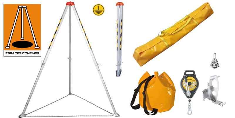 HARNAISPRO KIT TREPIED ESPACE CONFINE 3A - Comprenant : 1 trépied de sécurité compact HPTM9 + 1 sac de transport pour trépied, HPAX016 + 1 enrouleur antichute à câble de 25 m et de sauvetage, HPCRW30025 + 1 support de fixation pour l’enrouleur antichute et de sauvetage, HPAT171 + 1 poulie de renvoi HPPL101 + 1 sac de transport 35L HPAX010. Kit prêt à l’emploi pour l’évolution en espaces confinés. Simple et rapide de mise œuvre. Trépied et dispositif de sécurité intrinsèque EX. Dispositif antichute tout en un : permet de stopper une chute dans les meilleures conditions et d’évacuer la victime rapidement grâce au treuil de sauvetage intégré. Activité : accès en milieux confinés et atmosphères à risques (poste de relèvement, réseau d’assainissement, cuves, silos, réacteurs, cale de bateau...). Equipement de protection individuelle approprié aux exigences CATEC INRS.