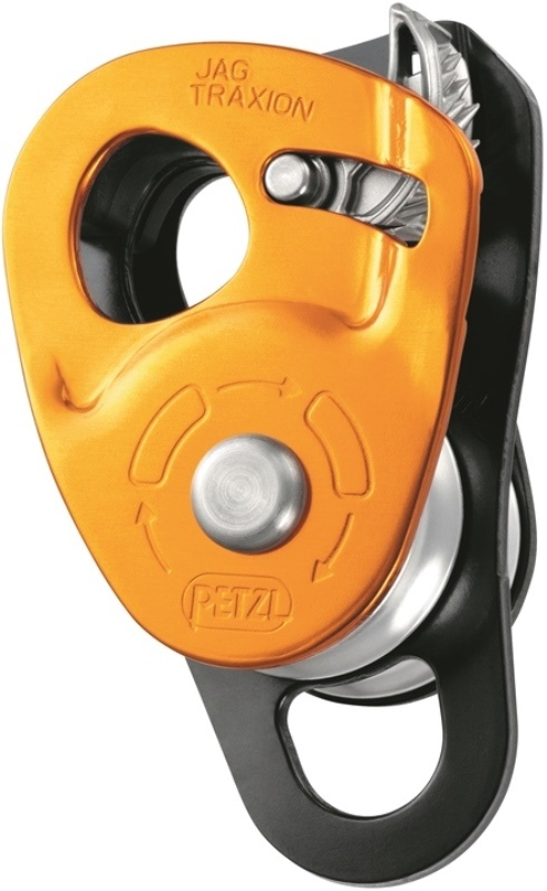 PETZL POULIE BLOQUEUR JAG TRAXION. Poulie-bloqueur double à haut rendement.La poulie-bloqueur double JAG TRAXION est destinée à être utilisée avec la poulie double JAG pour réaliser un mouflage 4:1. Les réas sur roulement à billes étanche assurent un excellent rendement.