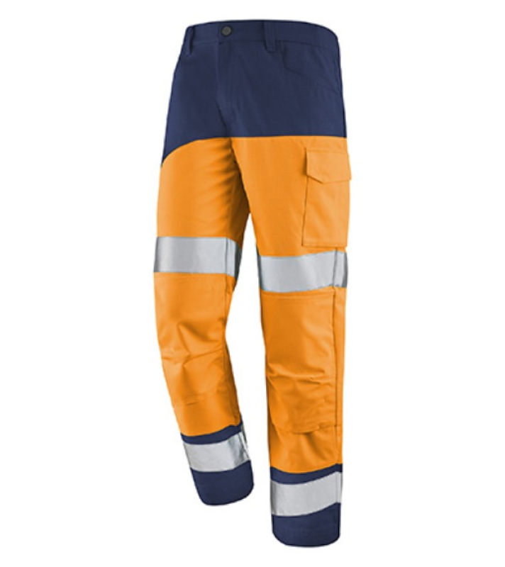 PANTALON DE TRAVAIL HAUTE VISIBILITE POCHE GENOUX V-LINE. COTON / POLYESTER. EN ISO 13688, EN ISO 20471 CL2, EN 14404. T36/38 À 60/62 - ORANGE/MARINE ref.PAN9B85OMR