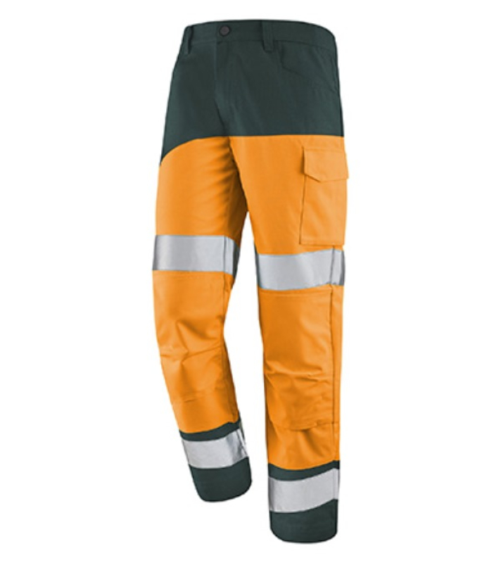 PANTALON DE TRAVAIL HAUTE VISIBILITE POCHE GENOUX V-LINE. COTON / POLYESTER. EN ISO 13688, EN ISO 20471 CL2, EN 14404. T36/38 À 60/62 - ORANGE/VERT US ref.PAN9B85OV