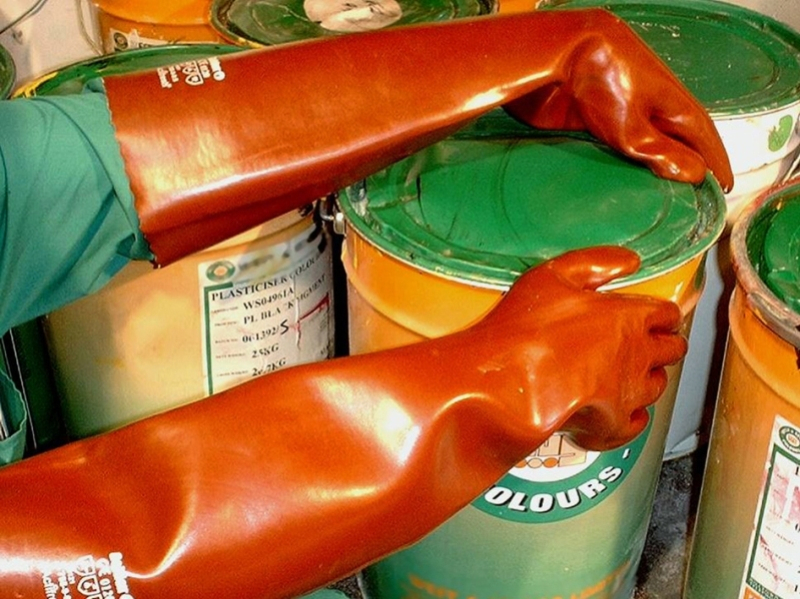 GANT PETROLIER CAT 3, RAFFINAGE, CARBURANT, ASSAINISSEMENT. PVC LISSE ROUGE TOUT ENDUIT, LONG 40 CM, TU (9/10) ref.PVC740E