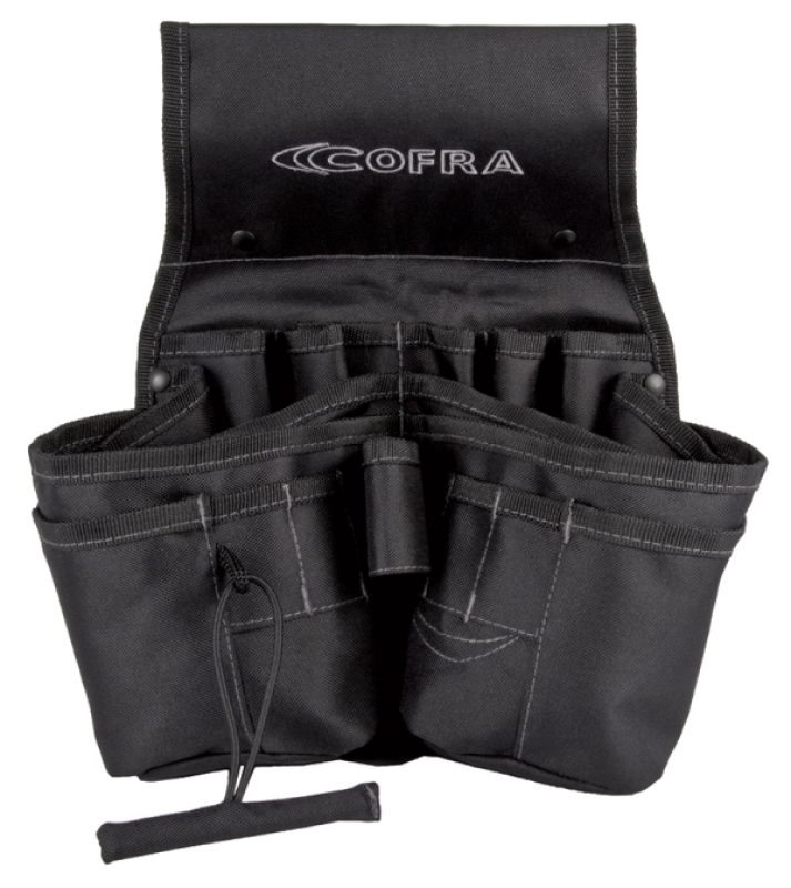 SACOCHE PORTE-OUTILS. Sacoche fonctionnelle réalisée en tissu nylon extrêmement durable. 4 poches larges centrales porte-clous et vis, 2 petites poches latérales, passant porte-marteau en tissu, emplacement pour ruban adhésif, poches dans le bas, compartiment à stylo et pour tournevis, rivets et coutures renforcées dans les points les plus sensibles à l’usure. Dim: 25 x 31 cm.