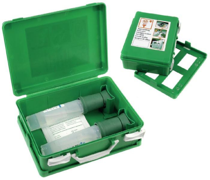 LAVEUR D’YEUX AUTONOME - TROUSSE / STATION MURALE équipée de 2 flacons de 200 ml contenant une solution de sérum physiologique stérile. Eoillère ergonomique avec couvercle anti-poussière. Idéal pour ateliers, hall de production, chantiers… Temps de péremption : 3 ans.