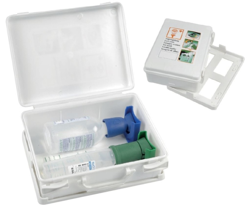 LAVEUR D’YEUX AUTONOME - TROUSSE / STATION MURALE RISQUE CHIMIQUE. Comprenant 1 flacon de 100 ml de solution sérum physiologique stérile et 1 flacon de 250 ml de solution ophtalmique stérile pH Neutral. Idéal pour ateliers, hall de production, chantiers, sites chimiques…. Temps de péremption : 3 ans.
