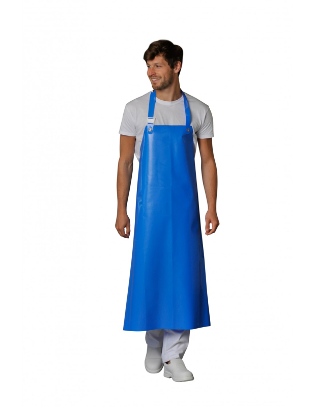 TABLIER AGRO PU. Tablier 100% PU 350 g/m² étanche avec bavette. Sangle cou avec boucle plastique réglable et attache dos élastique et crochet. Assemblage sans couture. Oeillets inox. Hauteur 115 cm. Taille unique. CONFORME AUX REGLEMENTS : UE (CE) 1935/2004 UE (CE) 10/2011 UE (CE) 2023/2006 N°1907/2006 REACH 21 CFR US FDA : 177.2600 CLASSE : EPI.1.