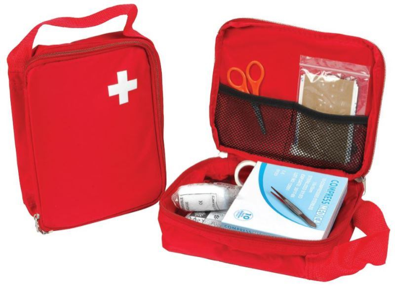 TROUSSE DE SECOURS VEHICULE 3 A 5 PERSONNES, en tissu souple et étanche, avec passant ceinture. Dimensions 200 x 160 x 50 mm. Facilement logeable dans une boîte à gants. Comprenant : 10 lingettes chlorhexidine, 10 compresses non tissées 20 x 20 cm, 10 pansements non tissés 4 tailles (4 pansements 19 x 72 mm + 3 pansements 50 x 60 mm + 2 pansements 75 x 45 mm + 1 pansement 100 x 60 mm), 1 bande extensible 3 m x 5 cm, 1 bande extensible 3 m x 7 cm, 1 sparadrap micropore 5 m x 2 cm, 1 ciseau 13 cm, 1 pince à échardes, 1 couverture de survie, 1 livret.