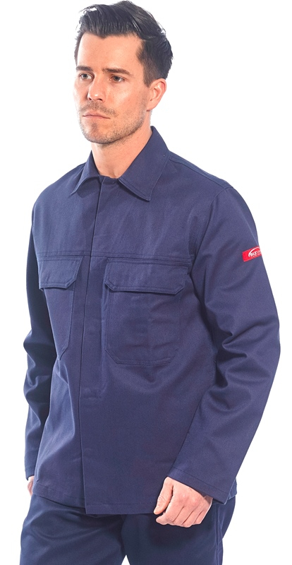 VESTE DE TRAVAIL IGNIFUGEE ANTI-FLAMME SOUDEUR. 100% Coton ignifugé traité flame retardant, 330 g/m². UPF 50+ Anti-UV EN 13758-2, EN ISO 13688, NFPA 2112, EN ISO 11612 (A1+A2, B1, C1, E1, F1), EN ISO 11611 Classe 1 (A1+A2), ASTM F1959/F1959M-12 (ATPV=11.2 Cal/cm2 (HAF=80.4%)). Taille S à 3XL (XS à 5XL en marine) (TAB PWH). Fermeture centrale à pressions cachés. Passant porte dosimètre. 2 poches poitrine avec rabat. 1 poche téléphone cachée. Poignets ajustables par pression. Finition double surpiqûres.Domaines d’utilisation : soudage à gaz, soudage TIG, soudage MIG, micro-soudage plasma, brasage, soudage par points, soudage MMA, industrie sidérurgique et métallurgique.