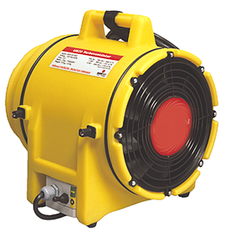 Turbo ventilateur compact, léger et très silencieux. Carcasse double en polyéthylène haute densité pour une excellente résistance aux chocs. Résistant à la corrosion et aux produits chimiques. Très fonctionnel avec ses dimensions réduites qui lui permettent de se loger dans n’importe quel coffre de véhicule. Spécialement conçu pour toutes les applications et interventions en espace confiné ou en atmosphère à risque: collecteurs et réseaux enterrés, silos, containers, soutes de navires, puits et mines, réseaux d’assainissements, etc… Pales de la turbine en polypropylène haute résistance. Protection IP65. CE. Fourni avec 5 m de câble électrique et une prise CEE 16A 240 V. Coloris jaune. Dimensions ext (Hxpxl) : 36 x 33 x 32 cm. Moteur : 245W 50 HZ. Débit air libre : 1392 m3/hr. Ampérage en fonctionnnement : 1,2 A. Poids : 7,3 kg. Equipement de protection approprié aux exigences CATEC INRS.