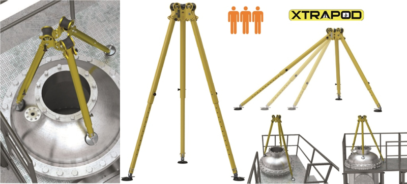 HARNAISPRO TREPIED XTRAPOD DE SECURITE ET DE LEVAGE COMPACT A VENTOUSES ANTIDERAPANTES POUR CUVES, 1,12 M REPLIE, 1,66 M DEPLOYE, CAPACITE 500 KG. L’XTRAPOD est un point d'ancrage conforme aux normes EN 795/B et CEN/TS 16415/B et peut être utilisé comme composant d'un équipement de protection contre les chutes, notament pour les interventions sur des cuves à surfaces irrégulières dans le cadre d'opérations en espaces confinés. L’XTRAPOD offre une protection pour jusqu'à 3 personnes en même temps.L’XTRAPOD est constitué d'une tête en aluminium thermolaquée, équipée de 3 galets en polyamide sur roulement à billes pour le guidage du câble de travail du treuil de levage et d’évacuation HPRUP502U20 / HPRUP50615 et le dispositif antichute à rappel automatique et de sauvetage HPCRW30025. La tête est également équipée de 3 points d'ancrage situés sur les parois latérales de la tête. Chacun de ces points peut être utilisé comme point d'ancrage pour l'équipement de protection contre les chutes. Chaque point d’ancrage est destiné à un utilisateur maximum.