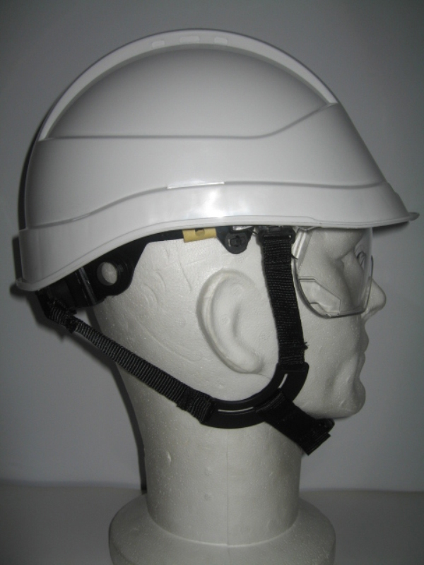 CASQUE POLYVALENT (industries, travaux en hauteur, travaux électrique) BLANC EN ABS AVEC LUNETTE INTEGREE (durée de vie 48 mois). Calotte ABS. Coiffe textile 4 points. Garniture frontale. Réglage par crémaillère. Jugulaire réglable 4 points de fixation avec fermeture boucle flash. Lunette de protection intégrée et rétractable (profondeur ajustable pour une parfaite adaptation au visage) en polycarbonate incolore anti-chocs, anti-U.V., traitée anti-rayures. Approuvé à 440 VAC. CE EN397, EN166 & EN170. Possibilté d’adapter des accessoires (anti-bruits, lampe frontale, visière grillagée,…).