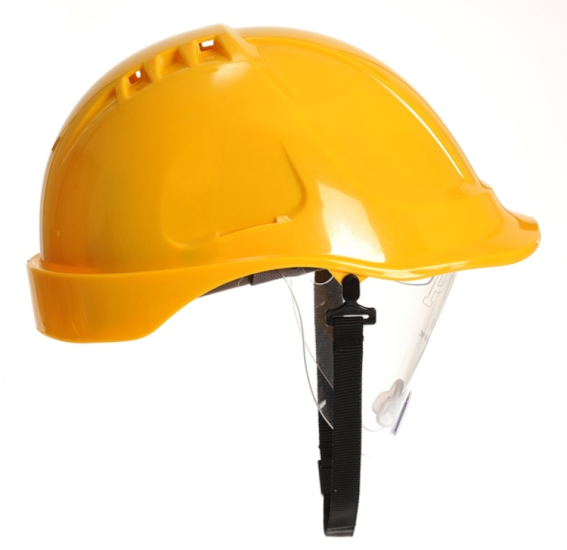 CASQUE INDUSTRIE ABS, VENTILE, AVEC LUNETTE DE PROTECTION INTEGREE (durée de vie maximum 7 ans). Casque avec coque ABS/Polycarbonate haute résistance. Visière réduite pour une bonne vision vers le haut. 4 orifices de ventilation permettant un flux d'air rafraîchissant autour de la tête. Coiffe intérieure avec harnais textile confort 6 points réglable par crémaillère de 56 à 63 cm (réglage de profondeur de casque possible également sur deux niveaux). Gouttière périphérique pour une bonne évacuation des eaux de pluie. Bandeau anti-sueur et jugulaire réglable inclus. Ecran lunette de protection rétractable en polycarbonate incolore avec traitement anti-rayures pour plus de durée, revêtement antibuée et pont de nez ergonomique pour plus de confort. Fentes latérales pour intégration d’un grand nombre d’accessoires (coquilles anti-bruit,…). Poids : 480 g. EN 397 (-30°C/+50°C, MM, LD) + EN 166 (1 FT).