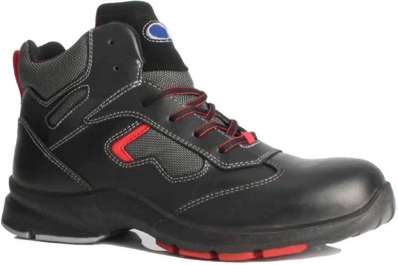 CHAUSSURE DE SECURITE POUR HOMME COMME POUR FEMME, TREKKING HAUT NOIR ET ROUGE AERE, METAL FREE, ESD.TIGE: cuir fleur lisse noir avec insert mesh respirant, hydrofuge.