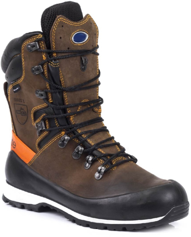 AVANTAGES: botte de sécurité à lacet pour bucherons et élagueurs, confortable et résistante avec des renforts accentués aux endroits stratégiques d’usure prématurée. Rangers anti-coupure scie à chaine de tronçonneuse doublée fibres kevlar destinées à l'élagage en milieux hostiles et agressifs (sols accidentés, boueux, rocheux,…) avec un parfait maintien du pied. Semelle intérieure Chromium Free. Insert CLIMA CORK SYSTEM (CCS) breveté Lavoro, en liège naturel intégré entre la semelle anti-perforation et la semelle extérieure, régulant le froid et le chaud, dispersant l'humidité, adaptant naturellement la chaussure à la voute plantaire pour une parfaite répartition uniforme de la forme du pied et du poids afin d'optimiser chaque appui et de diminuer au maximum les chocs et la fatigue (TMS). Semelle intercalaire anti-perforation acier et embout anti-choc acier profilé. Semelle extérieure en PU2D/Caoutchouc extrêmement résistante à l'abrasion et tenant à des températures au point de contact jusqu'à 300°C, antistatique, résistante à l'huile, aux hydrocarbures, antidérapante. Absorption d’énergie du talon. Tige en cuir pleine fleur buffle marron hydrofuge extrêmement souple, avec pourtour pare-pierre et bout recouvert PU pour une protection optimum à l'humidité et environnement tranchant. Doublure 3D haute densité anti-abrasion avec membrane Sympatex (100 % imperméable, 100 % coupe-vent et respirante, comme une seconde peau. Elle absorbe directement la vapeur d’eau et l’évacue. Mieux encore, la membrane Sympatex « respire » de manière dynamique, c’est à dire que plus l’activité physique est intense et plus la membrane fonctionne efficacement. Ainsi, le pied reste toujours au sec, même dans des situations extrêmes). Languette matelassée avec soufflet permettant d'éviter l'intrusion de corps étrangers. Souple et robuste, hydrofuge, avec une finition exemplaire, un look moderne et un excellent rapport qualité/prix. Fabrication Européenne.