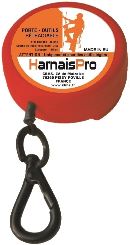 HARNAISPRO PORTE OUTIL RETRACTABLE PROTOOL. Porte-outils rétractable pour harnais de sécurité antichute. Implantation compacte et aisée par clip sur sangle de harnais. Sécurise les outils utilisés contre leur chute accidentelle. Rappel automatique (charge de travail maximum : 2 kg). Longueur maximum de cordelette sortie de 1,15 mètre. Mousqueton émerillon avec doigt simple action, avec une ouverture maximum de 10 mm. Dim : diam 80 mm. Poids : 120 g.