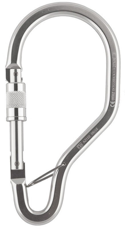 HARNAISPRO MOUSQUETON INTERCHANGEABLE TYPE EDF AZ122. Mousqueton aluminium à bague coulissante. Connexion rapide. Grande ouverture à verrouillage automatique. Linguet de maintien pour épissure de longe (évite l’utilisation d’un maillon intermédiaire et permet d'être réutilisé en cas d'endommagement de la longe). Longueur 260 mm. Résistance ? 20 kN. Ouverture 65 mm. Poids : 350 gr. EN 362.