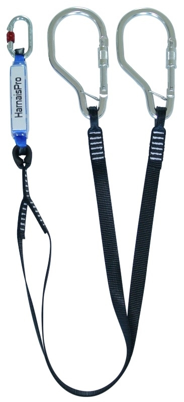 HARNAISPRO ABSORBER LIMITED-SY 150 AZ122. Longe antichute sangle Y avec absorbeur d’énergie intégré pour évolution sur structure métallique. Longueur de sangle (largeur 30 mm) avec l’absorbeur à extension limitée + connecteurs (OK KARAM + HPAZ122): 1,80 m. Extrémités en boucles cousues et cossées. Poids : 1320 g. EN 355.