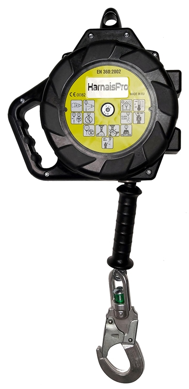 HARNAISPRO ANTICHUTE A RAPPEL AUTOMATIQUE D’UN CABLE ACIER GALVANISE 10 M, DIAMETRE 4 MM, AVEC DISSIPATEUR D’ENERGIE INCORPORE ET TEMOIN DE CHUTE. Testé pour utilisateur pesant jusqu’à 140 KG. Equipé d’un ancrage émerillon anti-vrillage, d’un mousqueton aluminium automatique double verrouillage ouverture 24 mm, doté d’un témoin de chute. Dissipateur d’énergie intégré. Coquille de protection en composite à haute résistance aux chocs. Cône d’utilisation du câble allant jusqu’à 40°. Poids : 4,2 kg. EN 360 + VG11.062.