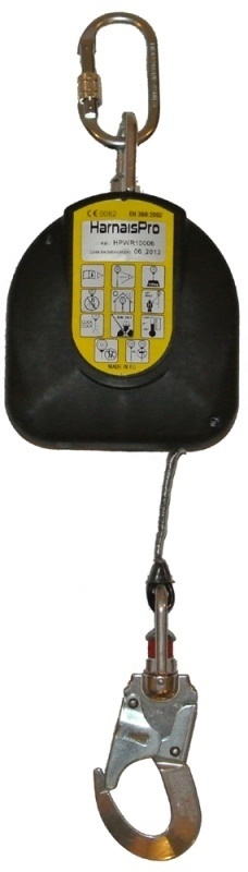 HARNAISPRO ANTICHUTE A RAPPEL AUTOMATIQUE DE SANGLE, LONGUEUR 6 M, AVEC DISSIPATEUR D’ENERGIE INCORPORE ET TEMOIN DE CHUTE. Testé pour utilisateur pesant jusqu’à 120 KG. Sangle polyester / Kevlar de 17 mm de largeur. Ancrage émerillon évitant de vriller la sangle. Equipé d’un mousqueton OK KARAM et d’un mousqueton aluminium automatique double verrouillage ouverture 24 mm, doté d’un témoin de chute. Dissipateur d’énergie intégré. Coquille de protection ABS. Cône d’utilisation de la sangle allant jusqu’à 40°. Poids : 1,7 kg. EN 360.