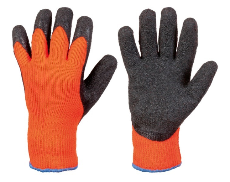 GANT FROID -20°C, MECANIQUE, TRICOTE UNE PIECE FLUO ORANGE, ENDUCTION PAUME LATEX CREPE NOIRE, POIGNET ELASTIQUE, T8 A 11 ref.ISO486