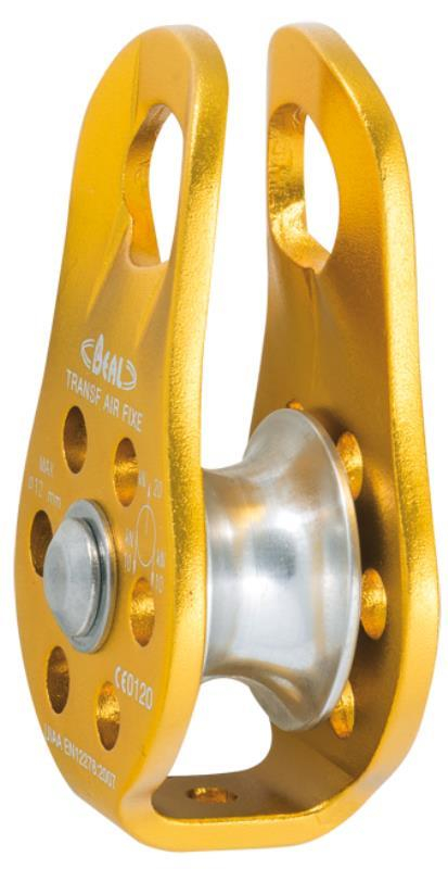 BEAL TRANSF’AIR FIXE, POULIE SIMPLE A FLASQUES FIXES . Poulie compact polyvalente. Poulie légère et compacte à flasques fixes en aluminium. Conçue pour les mouflages et les déviations de charges. Axe et rondelle en acier inoxydable. Bon rendement assuré par un réa monté sur bague en bronze. Pour cordes jusqu’à 12 mm de diamètre. Charge de rupture 20 kN. Poids : 90 g. EN12278.
